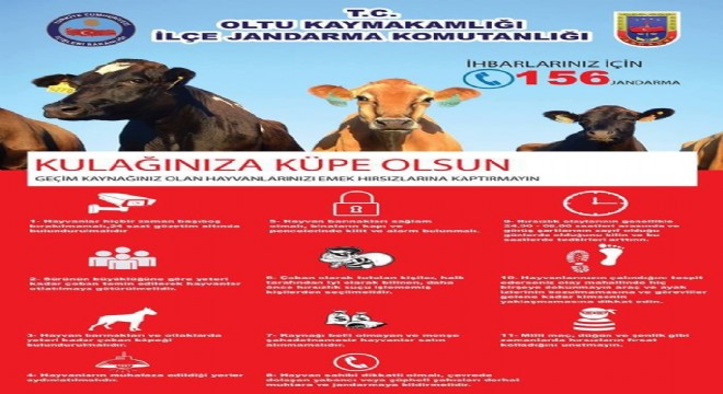 Oltu kaymakamlığı İlçe Jandarma Komutanlığı tarafından hayvan hırsızlığının önlenmesine yönelik, alınması gereken tedbirlerin sıralandığı bir afiş yayınlandı. İlçe merkezi ve tüm mahallelerde vatandaşların sıklıkla geçtiği cadde ve sokaklara asılan afişler ile vatandaşlar uyarıldı.