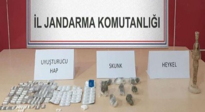 Kars’ta jandarma ekiplerince yapılan uygulamalarda uyuşturucu madde ve tarihi eser olarak değerlendirilen 1 heykel ele geçirildi.
