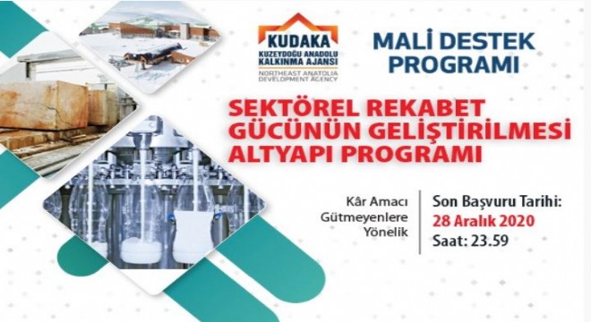 Kuzeydoğu Anadolu Kalkınma Ajansı (KUDAKA) sektörel rekabet gücünün geliştirilmesi altyapı programı 3 Kasım 2020 tarihi itibari ile ilan edildi. Erzurum, Erzincan ve Bayburt illerinde uygulanacak olan programın toplam bütçesi 30milyon TL. Sektörel rekabet gücünün geliştirilmesi altyapı programına bölgede faaliyet gösteren kar amacı gütmeyen kurum ve kuruluşlar başvuru yapabilecek.