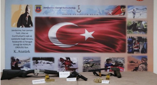 Cumhuriyet Başsavcılığı koordinesinde alınan arama kararı ile şüphelinin evine operasyon düzenlendi. Şüphelinin evinde yapılan aramada, 1 adet ruhsatsız 9 mm. çapında tabanca, 2 adet ruhsatsız av tüfeği, 50 adet 9 mm. çapında dolu tabanca fişeği, 4 adet av tüfeği fişeği ve 1 adet muşta ele geçirildi.