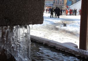 Buzlanmanın oluştuğu Erzurum kent merkezinde şadırvanlar buz tuttu, çatılardan sarkan buz sarkıtların boyu 1,5 metreye ulaştı.