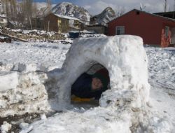 Meyve kasalarına ve muz kutularına kar doldurarak kare şekli verdikleri kar kütlelerini dizerek ev yapan kardeşlerden Kadir Maraşlı, “Eskimoları hep merak ettik en çokta o evlerini nasıl yaptıklarını belgeselde izledik biraz örnek alarak karda fazla yağınca Eskimo evi yapmaya karar verdik. Kardeşimle beraber muz kutularına karları doldurup şekil veriyoruz. Verdiğimiz kare şeklindeki kar kütlelerini de bir araya getirerek evimizi yapmış olduk. Biraz küçük oldu ama ilk deneyimimizde böyle bir ev yapmayı başardık.” Dedi.