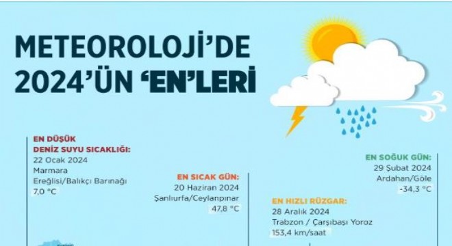 Çevre, Şehircilik ve İklim Değişikliği Bakanlığı’na bağlı Meteoroloji Genel Müdürlüğü, 2024 yılında Türkiye’de gerçekleşen meteorolojik rekor verilerini açıkladı. 2024 yılında en yüksek sıcaklık 20 Haziran’da 47,8 derece ile Şanlıurfa’nın Ceylanpınar ilçesinde ölçüldü. İl merkezlerinde ölçülen en yüksek sıcaklık değeri ise 12 Haziran’da 44,6 derece ile Aydın’da ölçüldü.