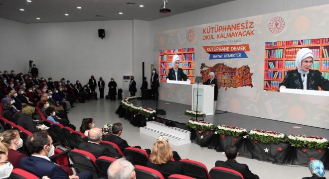 Kütüphanesiz Okul Kalmayacak projesinin tanıtım programında konuşan Emine Erdoğan, “Dijital dönüşümün yaşandığı çağımızda internetin her şeyi bildiği yanılgısı kütüphaneleri bir süre yalnızlığa mahkum etti. Oysa dünya ne kadar değişirse değişsin kütüphanelerin hayatımızdaki yeri vazgeçilmezdir. Bugün tüm dünyada kütüphanelerin geçirdiği dönüşüm son derece sevindiricidir. Kütüphaneler artık dolu rafları olan kitap müzeleri değil, birer yaşam alanı olarak karşımıza çıkıyor. Dijital koleksiyonlarla her yaşa ve gruba hitap eden etkinliklerle birer cazibe merkezi haline geliyorlar. Ayrıca kütüphaneler eğitimin ve okulların kalbidir. Projemizin tüm okullarda bu kalbin hızlı bir şekilde vesile olacağına inanıyorum. 81 ilimizde hem kütüphanesi olmayan okullara kütüphane kazandırılacak hem de hali hazırdaki kütüphane içerikleri zenginleştirilecek” ifadelerini kullandı.