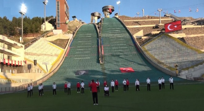 Erzurum’da milli sporcular, 19 Mayıs Atatürk’ü Anma, Gençlik ve Spor Bayramı dolayısıyla Kayakla Atlama Kulesi’nde İstiklal Marşı okudu.