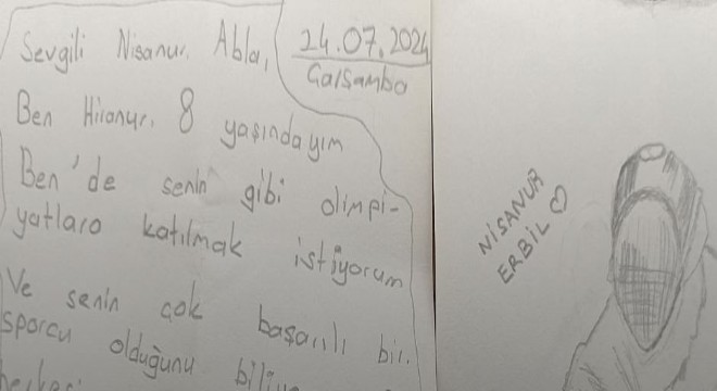 Mektuplar; milli forma, madalya, kupa, olimpiyat halkaları ve olimpiyat meşalesiyle süslenirken, öğrencilerden Hiranur Sarsık, mektubunda büyüdüğünde kendisi gibi olmak istediği kılıç branşında Türkiye’yi temsil eden ilk kadın sporcu olan Milli Eskrimci Nisanur Erbil’in resmini çizdi.