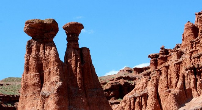 Erzurum’un Narman ilçesinde bulunan ‘Kırmızı Periler Diyarı’ olarak da adlandırılan Narman Peri Bacaları, rengi ve şekilleriyle göz kamaştırıyor.