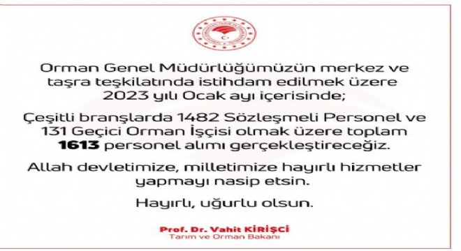 Tarım ve Orman Bakanı Vahit Kirişci, Orman Genel Müdürlüğüne personel alımıyla ilgili sosyal medya hesabından yaptığı açıklamada, "Orman Genel Müdürlüğümüzün merkez ve taşra teşkilatında istihdam edilmek üzere 2023 yılı Ocak ayı içerisinde, çeşitli branşlarda bin 482 sözleşmeli personel ve 131 geçici orman işçisi olmak üzere toplam bin 613 personel alımı gerçekleştireceğiz. Allah devletimize, milletimize hayırlı hizmetler yapmayı nasip etsin" ifadelerini kullandı.
