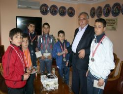 Turnuva dönüşü güreşçiler, Oltu Belediyesi Güreş Eğitimi Merkezi Antrenörü Erturan Ay nezaretinde Belediye Başkanı İbrahim Ziyrek’i makamında ziyaret ettiler.