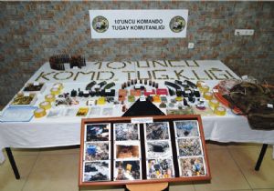 “Uzaktan komutalı hale getirilmiş 10 telsiz, 13 patlatmada kullanılan anahtar düzeneği, 2 patlayıcı devresi hazırlamakta kullanılan ampermetre, 1 patlayıcı devresi hazırlamak için havya ve lehim teli, 25 adet patlayıcı düzeneği yapımında kullanılan akım artırıcı cihaz, 150 büyük boy pil, 1 adet patlayıcı tuzaklamada kullanılan güneş enerji paneli, bin 600 metre patlayıcı ateşlemesi için kablo, 100 kilo patlayıcı madde, yarım kilo plastik patlayıcı madde, 2 telsiz şarj aleti, 1 metre patlayıcı yapımında kullanılan fitil, 5 metre patlayıcı yapımında kullanılan fiber optik kablo, 20 adet elektrikli fünye, 10 adet patlayıcı tuzaklamada kullanılan motosiklet aküsü, 1 şarj cihazı, 1 hassas terazi, 3 adet köpük, 2 piknik tüpü, 1 mutfak tüpü, 30 adet koli bandı, 30 litre benzin, 5 litre 10/40 motor yağı, 5 kilo gres yağ, 2 litre tiner, 1 adet roketatar mühimmatı ps6 serisi, 52 adet 12,7 mm fişek, 6 kaleşnikof piyade tüfeği şarjörü, 850 adet 5.56 mm fişek, 181 adet kaleşnikof piyade tüfeği mühimmatı, 10’ar kilo halinde 100 kilo beyaz peynir, 300 kilo un, 150 kilo turşu, 50 kilo çay, 50 kilo şeker, 10 kilo soğan, tencere, bardak, çatal, kaşık, çaydanlık, 7 sırt çantası, 5 uyku tulumu, 8 panço, 22 ayakkabı, 3 mont, 50 çift yün çorap, 20 bel kuşağı, 5 adet bayan iç çamaşırı, 8 sivil elbise (kot pantolon, kazak), 6 palaska, kütüklük ve 500 metre sera naylonu imha edildi.”