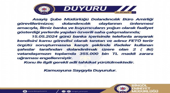 Bingöl İl Emniyet Müdürlüğü’nden yapılan açıklamada, “Asayiş Şube Müdürlüğü Dolandırıcılık Büro Amirliği görevlilerimizce, dolandırıcılık olaylarının önlenmesi amacıyla, ilimiz banka ve kuyumcuların yoğun olarak faaliyet gösterdiği yerlerde yapılan özverili saha çalışmalarında, banka içerisinde telefonla arayarak kendisini kamu görevlisi olarak tanıtan ve adınız FETÖ terör örgütü soruşturmasına karıştı şeklinde ifadeler kullanan şahıslar tarafından dolandırılmak üzere olan 2 vatandaşımızın toplamda 355 bin TL maddi zarara uğraması engellenmiştir. Konu ile ilgili gerekli tahkikat yürütülmektedir” denildi.