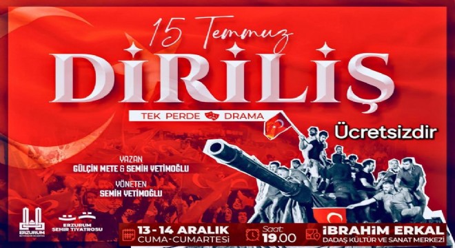 Erzurum Şehir Tiyatrosu “15 Temmuz Diriliş“ adlı oyununu 13-14 Aralık tarihlerinde, saat 19.00’da İbrahim Erkal Dadaş Kültür ve Sanat Merkezi'nde ücretsiz olarak sahneleyecek.