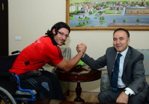 ERZURUM (İHA) - Avrupa Bilek Güreşi Şampiyonu Gökhan Seven Erzurum Valisi Dr. Ahmet Altıparmak’ı ziyaret etti. Bedensel engelli sporcuyu tebrik eden Vali Altıparmak başarısının devamı için kendisine her türlü desteği sağlayacağını söyledi.