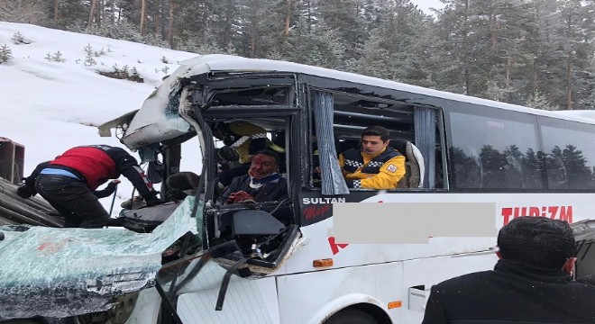 Ön tarafı hurdaya dönen midibüste sıkışan yaralılar jandarma ve itfaiye ekiplerinin çalışması sonucu çıkarıldı.