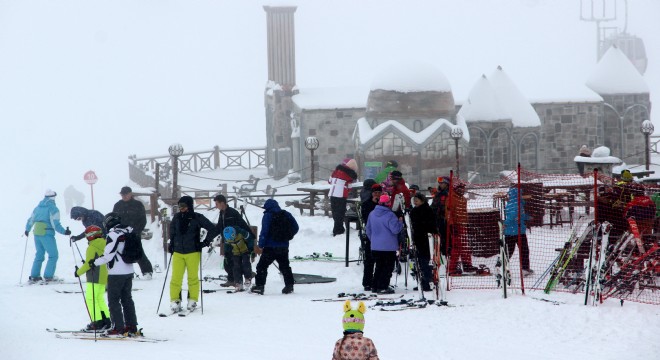 Kış turizminin gözde mekânlarından Palandöken'de tatilciler, sisle kaplanan kayak merkezinde kayak ve snowboard yapmanın tadını çıkardı.
