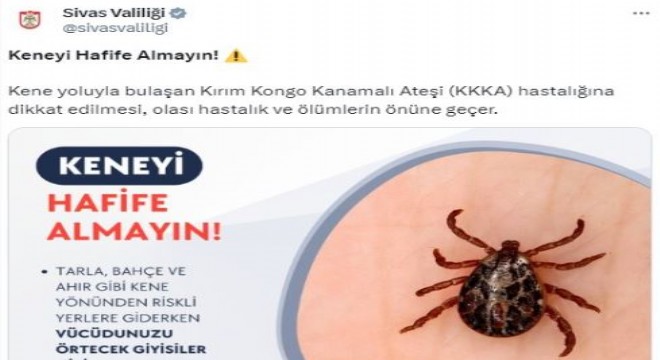 Sivas Valiliği kene popülasyonundaki ciddi artış üzerine sosyal medya hesapları üzerinden yaptığı paylaşımla, vatandaşları Kırım Kongo Kanamalı Ateşi hastalığı konusunda uyardı.