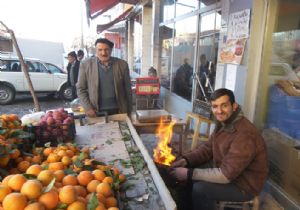 Narman ilçesinde yaşanan aşırı soğuk havalar nedeniyle manavlık işiyle uğraşanlar da teneke içerisinde ateş yakarak meyve ve sebzelerin bozulmamasına çalışıyorlar.