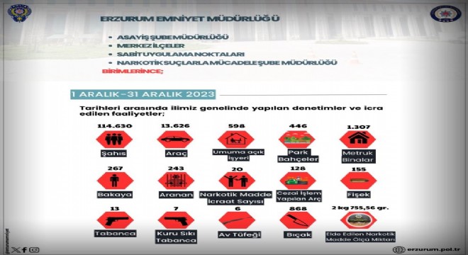 Edinilen bilgiye göre, son bir ay içerisinde yapılan denetimlerde 114 bin 630 şahıs kontrol edildi. 23 bin 626 araç, 598 umuma açık işyeri, 446 park bahçe, 1307 metruk bina kontrol edildi. 128 araç hakkında cezai işlem uygulanırken, 20 narkotik uygulaması gerçekleştirildi. Yapılan uygulamalarda 13 tabanca, 7 kuru sıkı tabanca, 6 av tüfeği, 868 bıçak ele geçirildi. Yapılan çalışmalarda aynı dönemde 2 kg 755,56 gr uyuşturucu yakalandı.