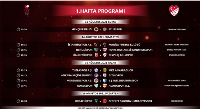2021-2022 sezonu TFF 1. Lig 1, 2 ve 3. hafta müsabakalarının programı açıklandı.