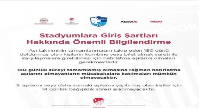 Aşı takviminin tamamlanmasını takip eden 180 günü doldurmuş olan kişilerin kombine veya bilet almak sureti ile karşılaşmalara girebilmesi için hatırlatma aşılarını olmaları gerekmektedir. 180 günlük süreyi tamamlamış olmasına rağmen hatırlatma aşılarını olmayanların müsabakalara katılmaları mümkün olmayacaktır. 3. aşılarını veya daha sonraki aşılarını yaptırmış olan kişiler için 14 günlük bağışıklık süresi aranmayacaktır."