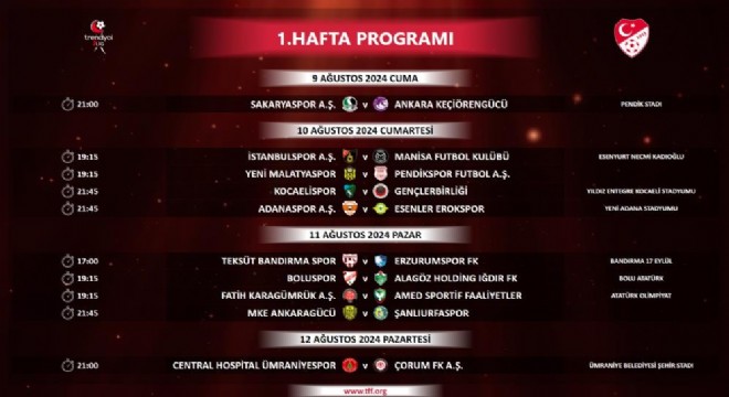 Trendyol 1. Lig'de ilk 5 haftanın programı şöyle: