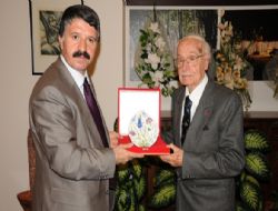 Konferans sonrası Güzel sanatlar Fakültesi Dekanı Karcıoğlu, Tunalı’ya teşekkür plaket takdim etti.