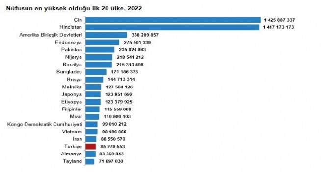 Türkiye, 85 milyon 279 bin 553 kişi nüfusu ile nüfus büyüklüğüne göre 194 ülke arasında 18. sırada yer alırken, dünya toplam nüfusunun yüzde 1,1'ini oluşturdu.