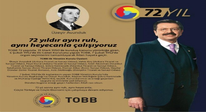 TOBB Başkanı Rifat Hisarcıklıoğlu, TOBB’un 72’nci yılı dolayıyla yaptığı açıklamada, “Kurucularımızı ve emeği geçenleri saygı ve minnetle yad ediyoruz. Dünden bugüne katkı veren herkesten Allah razı olsun. 72 yıl sonra aynı ruh, aynı heyecanla güçlü Türkiye ve güçlü ekonomi için çalışmaya devam ediyoruz” dedi.
