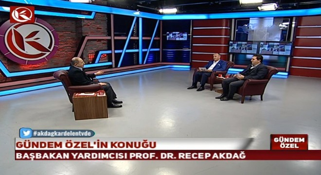 Başbakan Yardımcısı Prof. Dr. Recep Akdağ, Kardelen TV’de yayınlanan “Gündem özel” programının konuğu oldu. İHA Bölge Müdürü Ayhan Türkez ve Gazeteci Yazar Esat Bindesen’in gündeme ilişkin sorularını cevaplandıran Prof. Dr. Akdağ, önemli açıklamalarda bulundu.