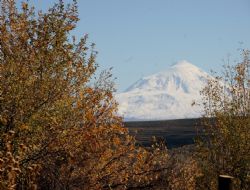 IĞDIR (İHA) - Türkiye'nin ve Avrupa'nın en yüksek dağı olan Ağrı Dağı'nın Iğdır rotasından seyrine doyumsuz sonbahar görüntüleri objektiflere yansıyor. Iğdır’dan bakıldığında; yılın ilk karı ile beyaz gelinliği giymiş Ağrı Dağı'nın eteklerindeki bozkırın ve sararmış ağaçların görüntüsü oluşan renk cümbüşü görenleri büyülüyor.