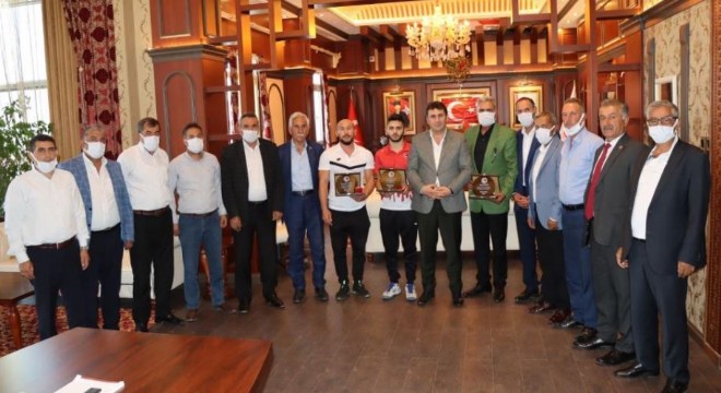 Dünya Şampiyonu olan Mehmet Akif Sönmez, Güreş Antrenörü İsmail Hakkı Özkan ve Çat Gençlik ve Spor İlçe Müdürü İkram Sönmez Çat Belediye Başkanı Melik Yaşar’ı makamda ziyaret ettiler. Başkan Yaşar, Şampiyon sporcuyu ve Antrenörü Altın ile ödüllendirip plaket verdi.