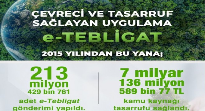 Adalet Bakanı Yılmaz Tunç, 2015 yılından itibaren uygulanan e-Tebligat ile 213 milyon 429 bin 761 adet iletinin muhataplarına elektronik ortamda ulaştırıldığını belirterek, “Böylece 7 bin 470 ton kağıttan tasarruf edildi. Çevre dostu e-Tebligat uygulamasıyla 126 bin 990 ağaç da kesilmekten kurtarıldı” dedi.