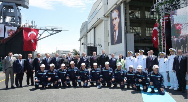 Erdoğan, ‘Ülkemiz, hâlihazırda dünyada bir savaş gemisini millî olarak tasarlayan, inşa eden ve idamesini gerçekleştirebilen 10 ülke arasında yer alıyor. Güçlendirdiğimiz Savunma Sanayii Başkanlığımızın, ordumuzun, tersanelerimizin, üniversitelerimizin, özel sektörümüzün ve özellikle KOBİ'lerimizin ahenkli çalışmasıyla hayata geçiyor. ‘ dedi