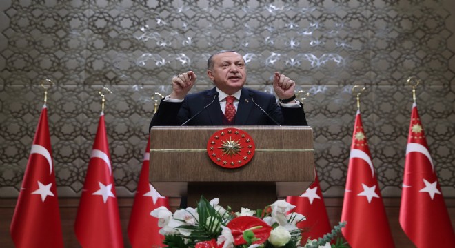 "Birilerinin başları sıkıştığında kuyruklarını bacaklarının arasına sıkıştırarak kaçacak ikinci, üçüncü vatanları olabilir, bizim yok. Onun için Türkiye’ye sahip çıkacağız" açıklamasında bulunan Erdoğan, "Bizim bu hassasiyetlerimiz ortadayken birilerinin ısrarla burnumuzun dibinde bir terör koridoru inşa etmesi çalışması karşısında sabrımız giderek azalıyor. Bunca zaman beklemiş olmamızın sebebi bu meseleyi, suhuletle, diplomasi ile karşılıklı anlayış ile çözme konusundaki ümidimizi koruyor olmamızdı. Geldiğimiz noktada bu yolların giderek kapandığını, geriye tek bir çarenin kaldığını görüyoruz. Suriye’de, Irak’ta yaşanan hadiselerin, sayıları milyona varan masumun kanı dökülmesi pahasına kurulan düzenin amacı her geçen gün daha net bir şekilde anlaşılıyor. Bize verilen sözlerin tutulmamasına. Gözümüze bakılarak yalan söylenmesine daha fazla tahammül etmek zorunda değiliz. Fırat Kalkanı Harekatı ile attığımız adımı tüm sınırlarımız boyunca genişletecek güce ve iradeye sahibiz. Türkiye hiç kimsenin kendi ülkesindeki iktidar oyununa meze olacak bir devlet değildir. Türkiye Amerika’nın bölgemizdeki tutarsız politikaların makasına getirilecek bir ülke değildir. Türkiye AB’nin bölgemizdeki gelişmeler karşısında sergilediği kifayetsizliğin bedelini ödemek zorunda olan bir ülke de değil. Biz 200 yıldır dört bir yandan üzerine üşüşen leş kargaları, akbabalar tarafından didiklendiği halde hala dimdik ayakta kalabilmiş bir ülkeyiz. Karşınızda ne Osmanlı’nın hasta adamı ne cumhuriyetin çömez devleti ne 1970’lerin, 1990’ların güçsüz ülkesi var. Artık karşınızda cumhurbaşkanından muhtarına kadar 2023 hedeflerine kilitlenmiş, 2053 ve 2071 vizyonuna inanmış bir millet var" dedi.