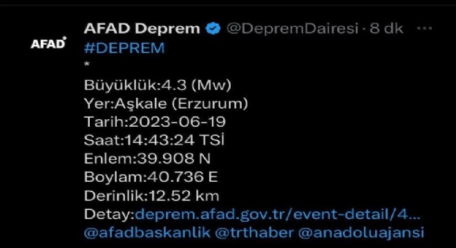 AFAD'ın verilerine göre saat 14.43 ‘de meydana gelen 4,3 büyüklüğündeki deprem 12,52 kilometre derinlikte gerçekleşti. Depremler Erzurum merkezde de hissedildi. Alınan ilk bilgilere göre meydana gelen depremde herhangi bir hasar ya da can kaybı yaşanmadı. Bu arada bu gün yine Aşkale’de saat 14:13’de 2,0 ve 14.20’de 3,2 büyüklüğünde depremler meydana geldi.
