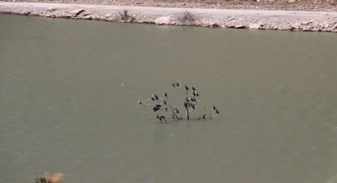 Su debisi düşen Oltu’nun Ayvalı Barajı’ndan ortaya çıkan kurumuş ağaç, karabatak kuşlarına adeta sığınak oldu.