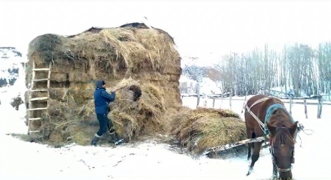 Karlıova ilçesinde çetin geçen kış aylarına rağmen besiciler, yaklaşık 1,5 kilometre boyunca at ve kızaklarla taşıdığı otlarla hayvanlarını besliyor.