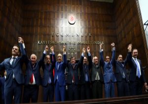 AK Parti Genel Başkanı ve Başbakan Ahmet Davutoğlu, TBMM grup toplantısında yaptığı konuşmada, "17, 25 Aralık kumpasları, MİT operasyonları, dışişleri dinlemeleri ile ihanet çeteleri çalışırken geçen yıl kararlı bir şekilde 30 Mart seçimlerine yürüdüklerini" belirterek, şöyle devam etti:"Birçok hesaplar yapıldı, aynen 2002'de olduğu gibi. Hani Genel Başkanımız milletvekili olmadığı için Başbakan olamaması sebebiyle o zaman AK Parti grubu dağılır diye düşünenler olduğu gibi, hani 2007'de e-muhtıra olduğunda AK Parti grubu sarsılır diye düşünenler olduğu gibi. Birileri sarsıldı ama AK Parti Grubu sarsılmadı. Hani parti kapatma davası açıldığında AK Parti'den büyük bir kopuş olur, herkes tek tek kendi şahsi hesabı içine girer diye beklentiler olduğu gibi. Geçen sene de birileri '30 Mart seçimlerinde bunlar yüzde 30'lara düşerler ve parçalanırlar' diyordu. Biz düşmedik ve parçalanmadık. Düşürecek olan da kaldıracak olan da Allahımızdır, milletimizdir. Sonra o olmadı. Cumhurbaşkanlığı seçimine giderken adaylar arasındaki ihtilaflar ve parti içindeki parçalanmalar sebebiyle bu grup birliğini, beraberliğini bozar diye düşündüler. O da olmadı. Sonra olağanüstü kongreye giderken ve Başbakanlık, Cumhurbaşkanlığı görevleri tevdi edilirken, değişim yaşanırken iç ihtilaf çıkar diye beklediler ve işte aynen Hz. Musa'nın, Hz. Peygamber'in, Gandi'nin daha yakın zamanlarda Martin Luther King'in, bizim Horasan erenlerinin, istiklal ordularının omuz omuza vermesi gibi AK Parti grubu omuz omuza verdi, mahviyet içinde davasını şahsi hesaplarının önüne aldı ve bütün hesapları boşa çıkardı.
