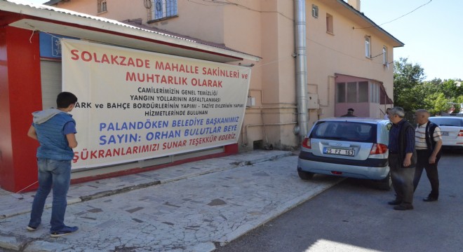 Palandöken ilçesinde, belediyenin çalışmalarından memnun olan mahalle sakinleri ve muhtar, ilçeye ve mahallelerine yaptığı çalışmalarından dolayı Palandöken Belediye Başkanı Orhan Bulutlara ve ekibine astıkları pankartlarla teşekkür ettiler.