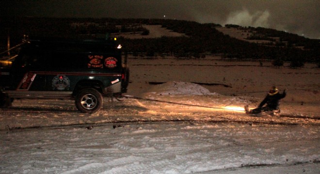 Erzurum’da Off-Road Kulübü, Palandöken’de yeni bir etkinliğe imza attı. Kulüp üyeleri, adını 'lastik raftingi' koydukları etkinlikte 4x4 araçların arkasına yaklaşık 5 metre uzunluğundaki halatla bağlanan tekerlekle kar üzerinde kaymanın keyfini yaşadı.