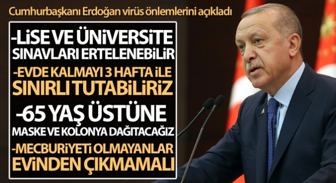 Cumhurbaşkanı Erdoğan, gerekli tüm tedbirlerin alındığını hatırlatarak, yapılan uygulamaları aktardı. Gerekli görülürse üniversiteye giriş ve liseye giriş sınavlarının erteleneceğini de söyleyen Erdoğan, “12 Mart’ta şahsımın başkanlığında yapılan toplantıda oldukça önemli tedbirler alarak, hemen uygulamaya geçirdik. Bunlar arasında; okulların tatil edilmesi, uzaktan eğitime geçilmesi, kamu çalışanlarının yurt dışı görevlerinin ertelenmesi, spor müsabakalarının seyircisiz oynanması gibi hususlarda yer alıyordu. Birileri farklı şeyler söyleyebilir. Bizim bütün hedefimiz, insan hayatıdır. Altyapısı uygun mesleki ve Anadolu liselerimizi dezenfektan ve cerrahi maske üretimi yapabilecek hale getirdik. Uzaktan eğitimi hem internet hem de televizyon aracılığıyla vererek tüm çocuklarımızın erişebilmesine imkan sağladık. Haziran ayında yapılacak Liselere Geçiş Sınavı ve Üniversiteye Giriş Sınavının soru hazırlıkları da tatil süreleri göz önünde bulundurularak yapılacak. Gelişmelere göre bu sınavları da ileri bir tarihe ertelemeyi gündemimize alabiliriz. Bugün 20 bin öğretmenimizin daha atamasını gerçekleştirdiğimizin müjdesini de paylaşmak istiyorum. İstihdam durdu diyorlar ya. Hayırlı olsun diyorum” şeklinde konuştu.