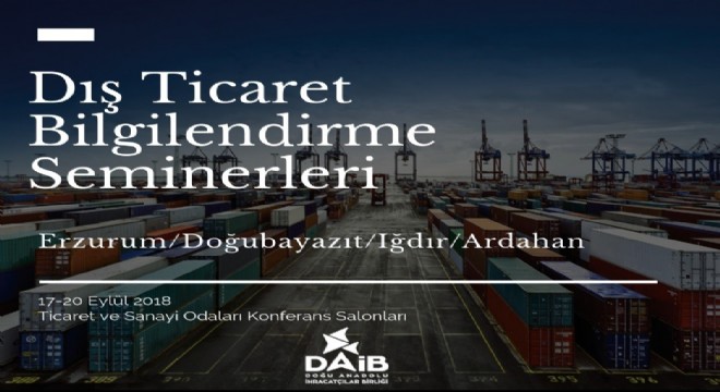 Doğu Anadolu İhracatçı Birliği (DAİB) ve Ticaret ve Sanayi Odaları işbirliğiyle, Erzurum, Doğubayazıt, Iğdır ve Ardahan'da Dış Ticaret Bilgilendirme Seminerleri" düzenlenecek.