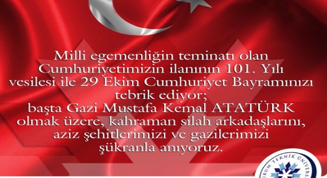 Erzurum Teknik Üniversitesi (ETÜ) Rektörlüğü, yayımladığı mesajla Cumhuriyetimizin kuruluşunun 101. Yıl gururunu paylaştı. ETÜ Rektörlüğü kutlama mesajında,  ‘Milli Egemenliğin teminatı olan Cumhuriyetimizin ilanının 101. Yılı vesilesi ile 29 Ekim Cumhuriyet Bayramımızı tebrik ediyor; başta Gazi Mustafa Kemal Atatürk olmak üzere kahraman silah arkadaşlarını, aziz şehitlerimizi ve gazilerimizi şükranla anıyoruz. ‘ kaydı düşüldü.