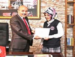 Okul Müdürü Ümit Gergit öncülüğünde İl Milli Eğitim Müdürü Abdullah Bilge'yi makamında ziyaret eden Rüveyda Elen'e, başarı belgesi ve çeşitli hediyeler verildi.