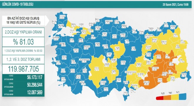 Aşılama oranlarını gösteren haritada yüzde 82,8 ile mavi kategoride bulunan Eskişehir, en çok aşı yapılan iller arasında 7’nci sırada yer alıyor. En az iki doz aşı olmuş 18 yaş ve üstü nüfus yüzdelerinin bulunduğu tabloya göre, Türkiye genelinde 1’inci doz aşı yapılma oranı yüzde 90,41 ve 2’nci doz aşı yapılma oranı yüzde 80,86 oldu. Ayrıca 3’üncü doz aşılama da dahil olmak üzere toplam uygulanan aşı sayısı 119.726.075 ulaştı. En çok aşı yapılma oranına sahip olan il ise yüzde 84,6 ile Ordu oldu.