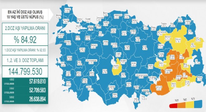 Sağlık Bakanlığı tarafından açıklanan tabloda, 2 doz aşılama verilerine de yer verildi. En az 2 doz aşı olmuş 18 yaş üzeri nüfusu kapsayan verilere göre Türkiye'de 2. doz aşılama ortalama yüzde 84,92 oldu. 1. doz ortalaması yüzde 92,83 olurken, 1., 2. ve 3. doz aşısını olan vatandaş sayısı toplamda 144 milyon 799 bin 530’e yükseldi.