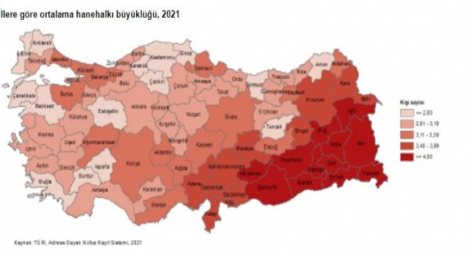 Türkiye İstatistik Kurumu (TÜİK), İstatistiklerle Aile 2021 bülteni açıkladı. Açıklamada, Adrese Dayalı Nüfus Kayıt Sistemi (ADNKS) sonuçlarına göre, Türkiye'de 2008 yılında 4 kişi olan ortalama hane halkı büyüklüğünün, azalma eğilimi göstererek 2021 yılında 3,23 kişiye düştüğü belirtildi.