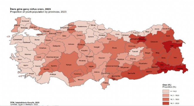 ADNKS sonuçlarına göre 2023 yılında genç nüfus oranının en yüksek olduğu il, yüzde 21,5 ile Hakkari oldu. Bu ili yüzde 21,1 ile Şırnak ve Siirt, yüzde 20,2 ile Bayburt izledi.