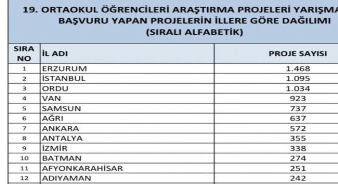 TÜBİTAK tarafından yapılan açıklama göre TÜBİTAK 2204-B 19. Ortaokul Öğrencileri Araştırma Projeleri Yarışması'na Türkiye genelinde 13 bin 918 başvuru yapıldı. Erzurum, bin 468 başvuru ile "Türkiye Birincisi" olurken; Erzurum'u sırasıyla bin 95 başvuruyla İstanbul, bin 34 başvuruyla Ordu, 923 başvuruyla Van ve 737 başvuruyla Samsun izledi.