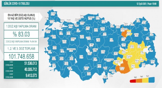 12 Eylül Pazar günü yayımlanan Kırmızı, turuncu, sarı ve mavi kategorilerle ifade edilen toplam nüfus içinde aşı oranı son haritasında Doğu Anadolu Bölgesinde mavi kategoriye giren il sayısı 10’a çıktı. Erzurum, Iğdır, Ağrı, Tunceli, Erzincan, Ardahan, Hakkari, Iğdır, Kars ve Van Mavi;, Muş, Bingöl, Bitlis ve Elazığ sarı kategoride yer aldı. Bölgede turuncu kategoride yer alan il kalmadı.